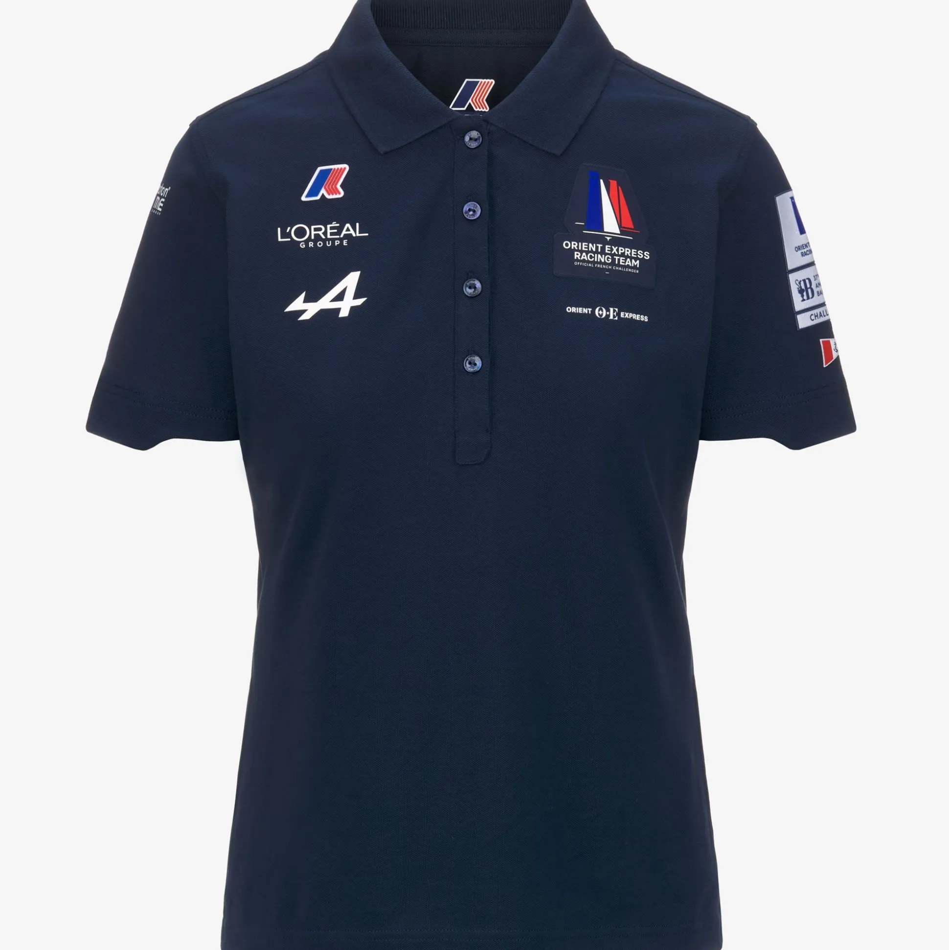 DROSINE ORIENT EXPRESS TEAM AC è la Polo da donna di K-Way che celebra la sponsorizzazione di Orient Express Racing Team in occasione della 37esima America’s Cup, perfetta per ogni avventura dal porto alla città. Realizzata in morbido piquet di cotone tecnico, con FIT SLIM e dettagli sul fondo manica che richiamano le onde del mare. Loghi esterni in applicazione di Orient Express, degli sponsor e di America’s Cup. Logo K-Way in silicone applicato.