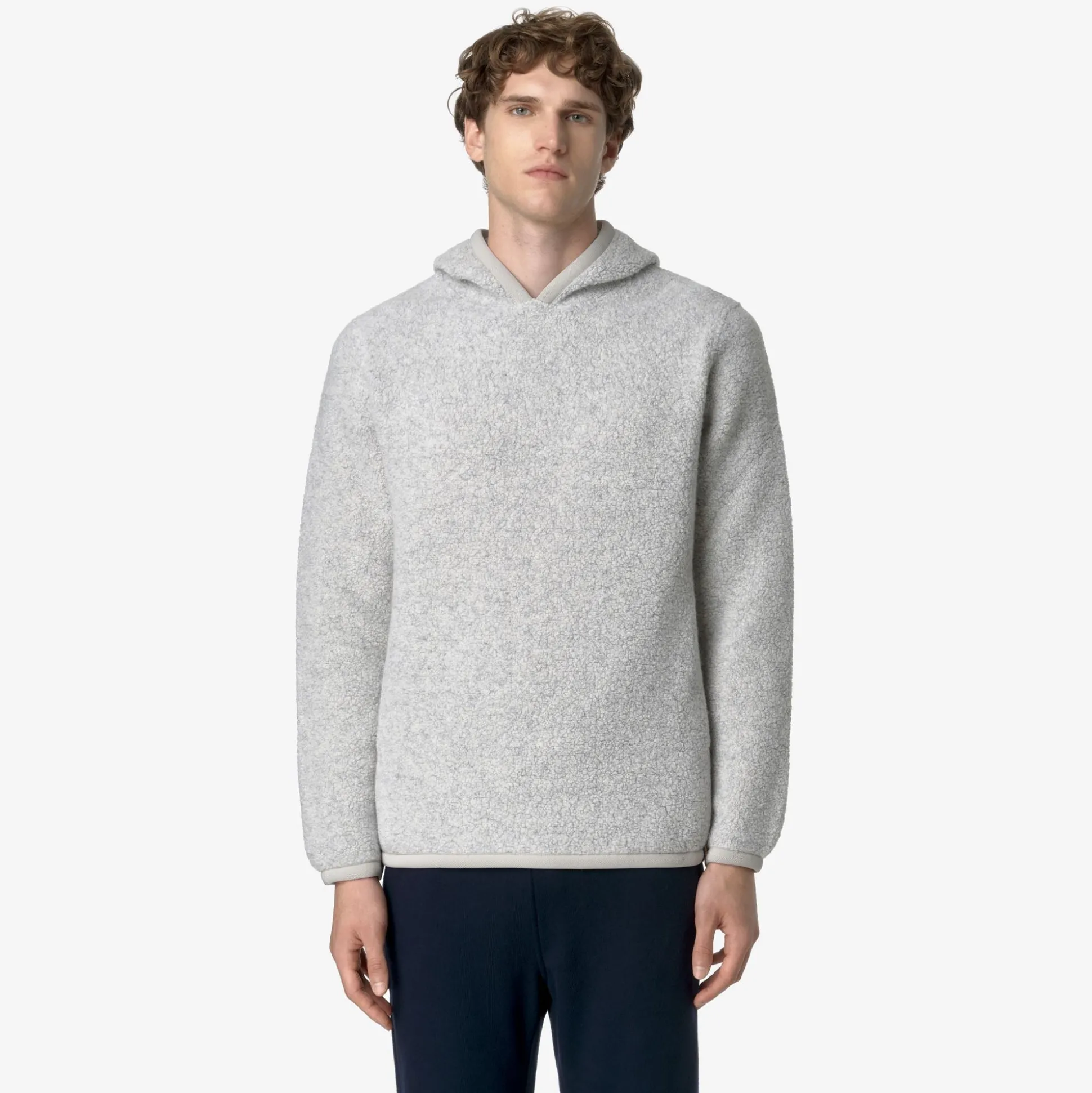Ernie è un pullover da uomo dal look caldo, morbido e accogliente, ideale per le occasioni leisure e realizzato con un tessuto orsetto misto lana riciclato. Il modello, dalle linee essenziali, presenta vestibilità regolare, polsini elastici, cappuccio e il dettaglio del tape nei colori iconici K-Way sul fianco.