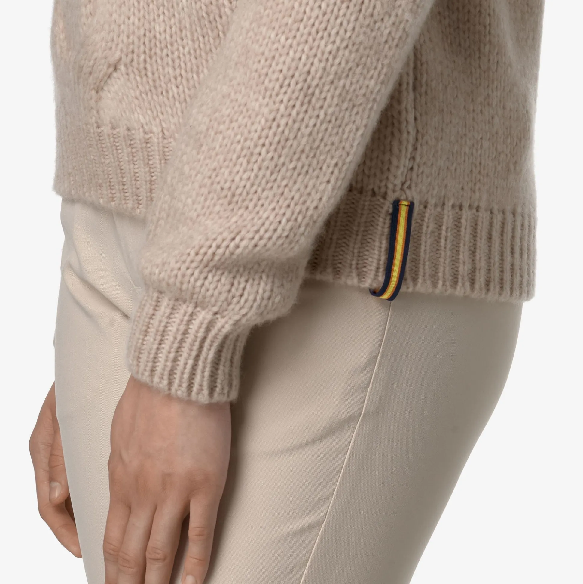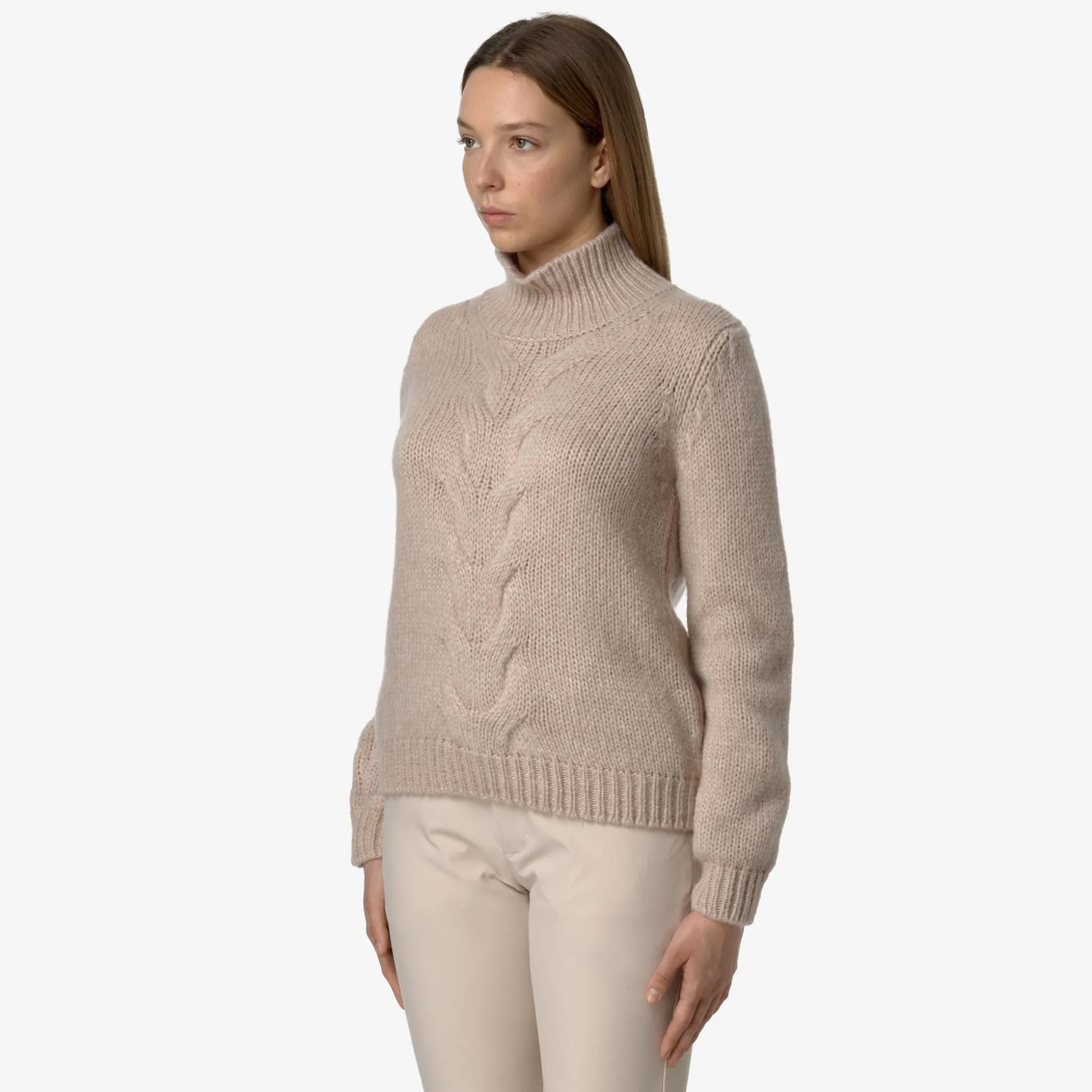 Fuzzy è un pullover a collo alto da donna dal look raffinato, accogliente e contemporaneo, ideale per l’utilizzo in occasioni casual e più formali, realizzato con un pregiato filato misto lana merino piacevolmente caldo, corposo e avvolgente e con un motivo a treccia sul fronte. Il modello presenta vestibilità regolare, collo e bordi a costine e il dettaglio del logo K-Way sul fianco.