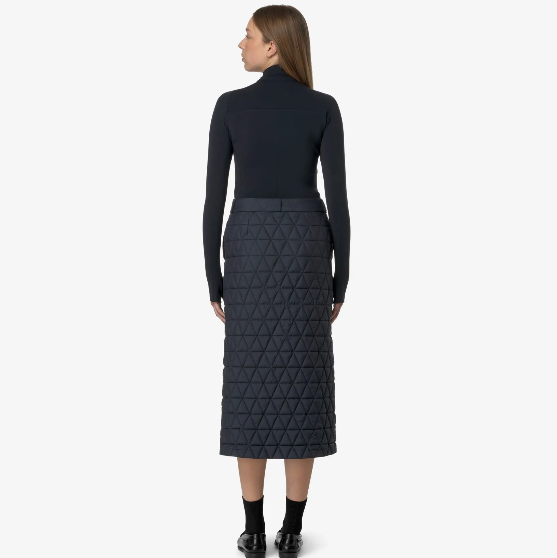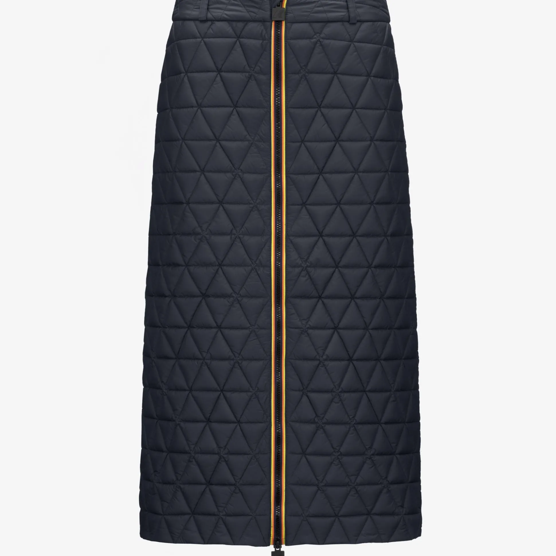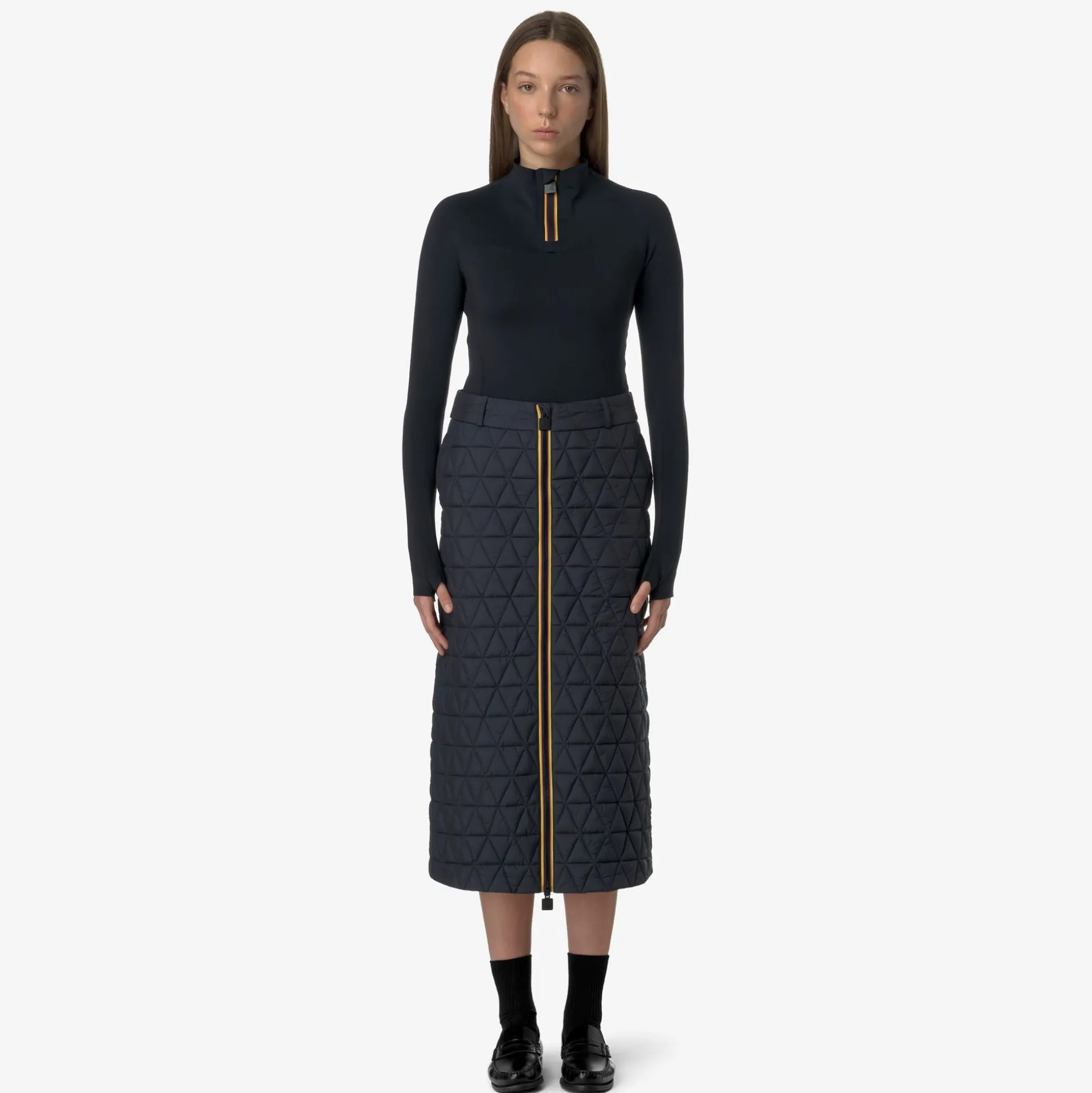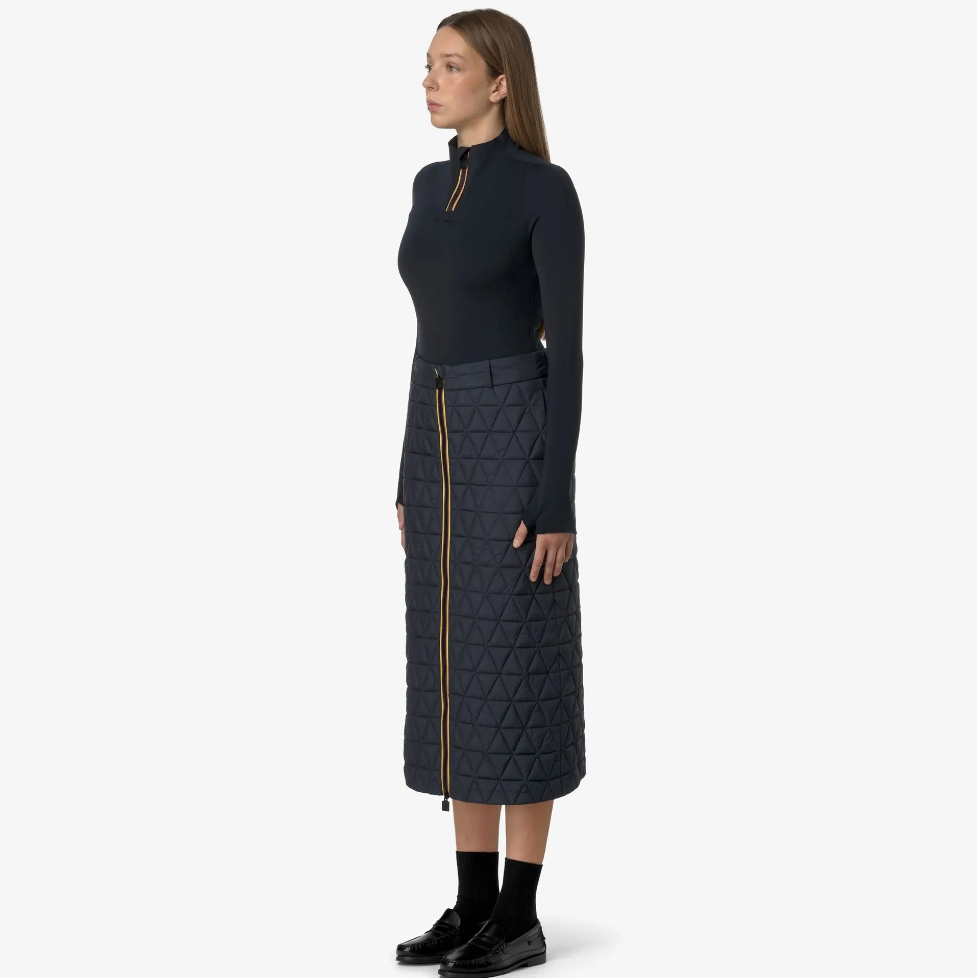 Maralie è una gonna lunga che interpreta con giochi di volumi e geometrie i look più contemporanei. Questo capo presenta una costruzione funzionale adatta ai primi freddi: un tessuto esterno trapuntato con leggero trattamento antipioggia e imbottitura in Thermore, una fibra ricavata dal poliestere riciclato. La gonna si distingue per la linea allungata, chiusura full zip nei colori iconici del tape K-Way, vita con passanti per cintura e tasche laterali.