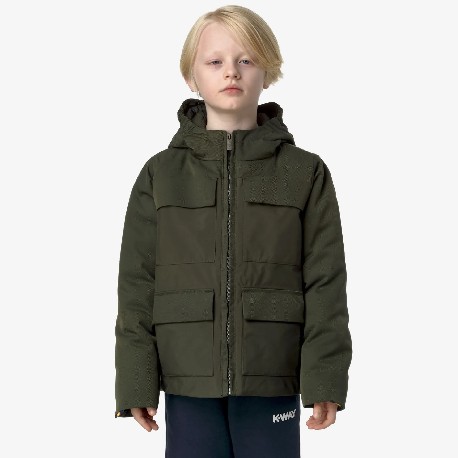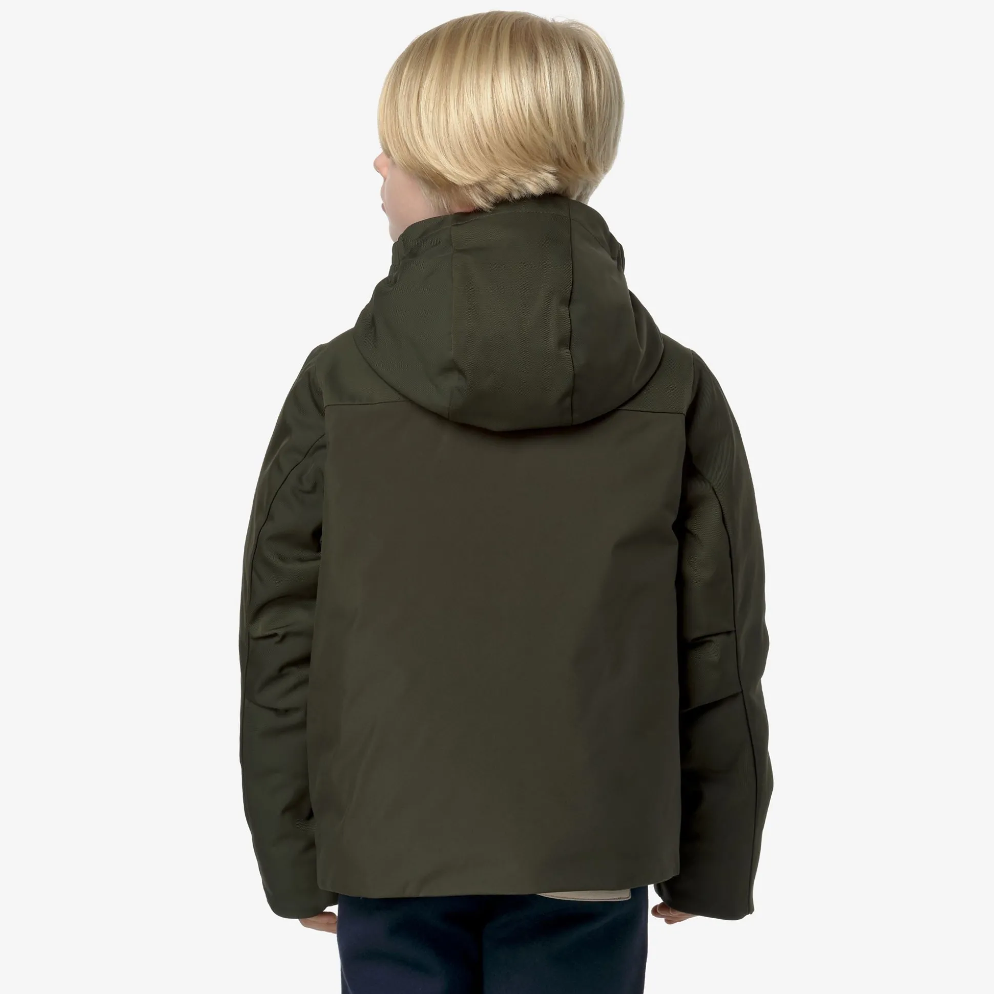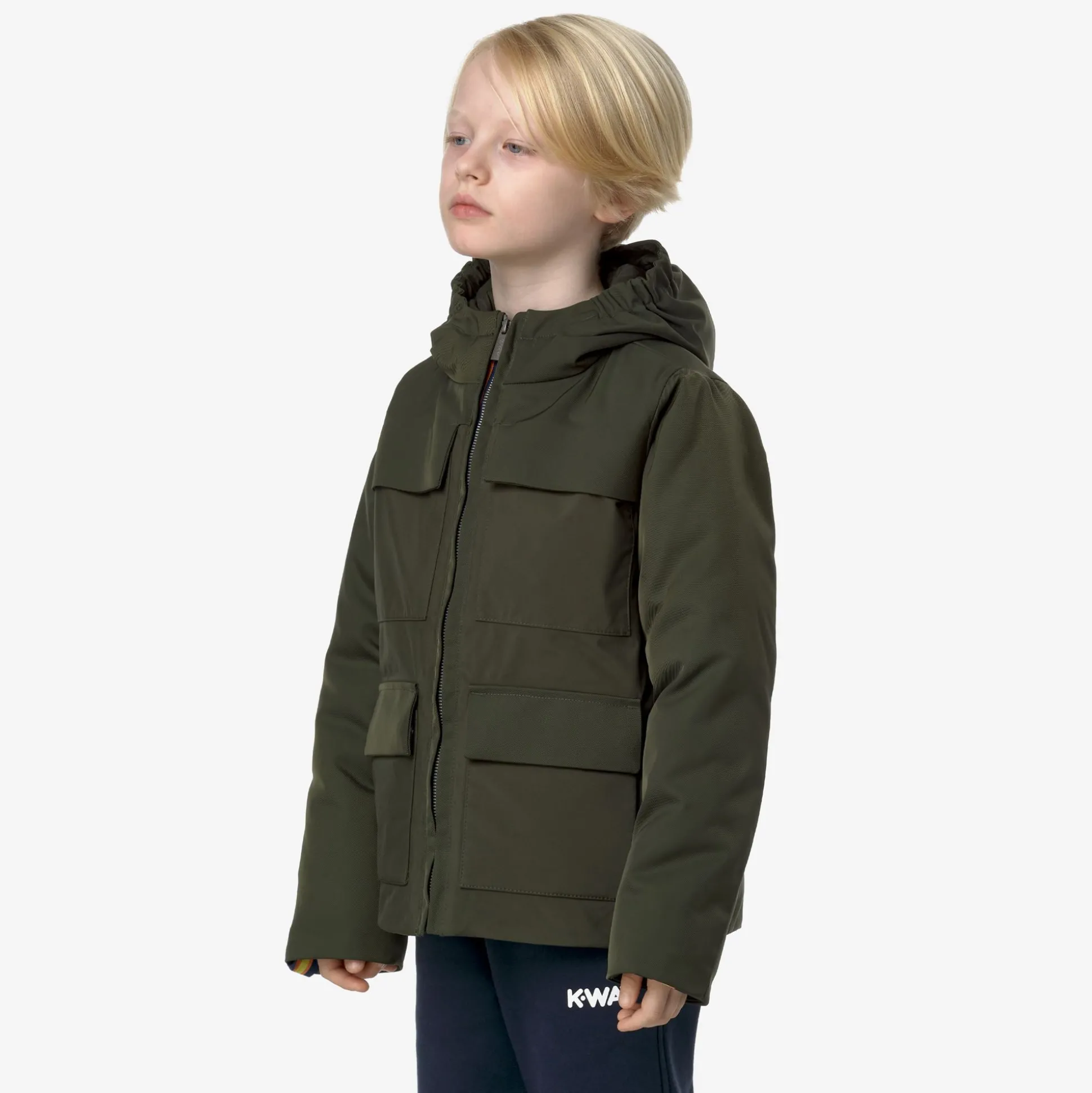 Hodin è una giacca corta da bambino, ideale per l’inverno, dal look dinamico e pulito ideale per la città grazie ai suoi dettagli funzionali e all’assenza di loghi sul fronte. Questa giacca, con vestibilità regolare e chiusura a zip, presenta un esterno in nylon impermeabile combinato con inserti in tessuto a motivo twill e un’imbottitura in piuma Molina che garantisce un grado di calore medio. Il modello ha un cappuccio avvolgente e regolabile, 4 tasche con patta e bottoni a pressione e il dettaglio del tape K-Way sul polsino.Tessuto twill