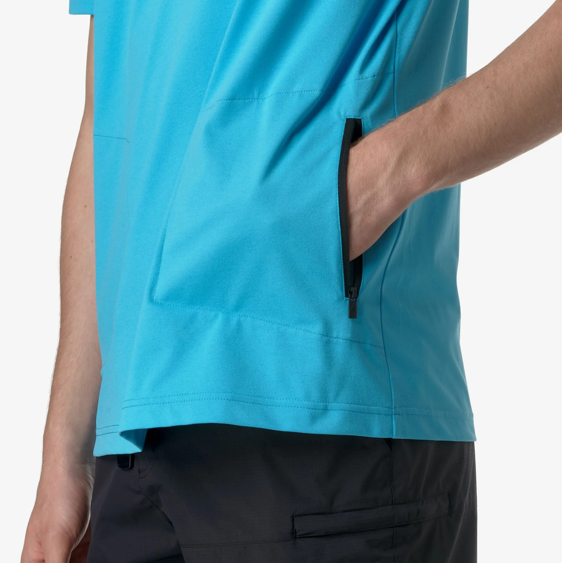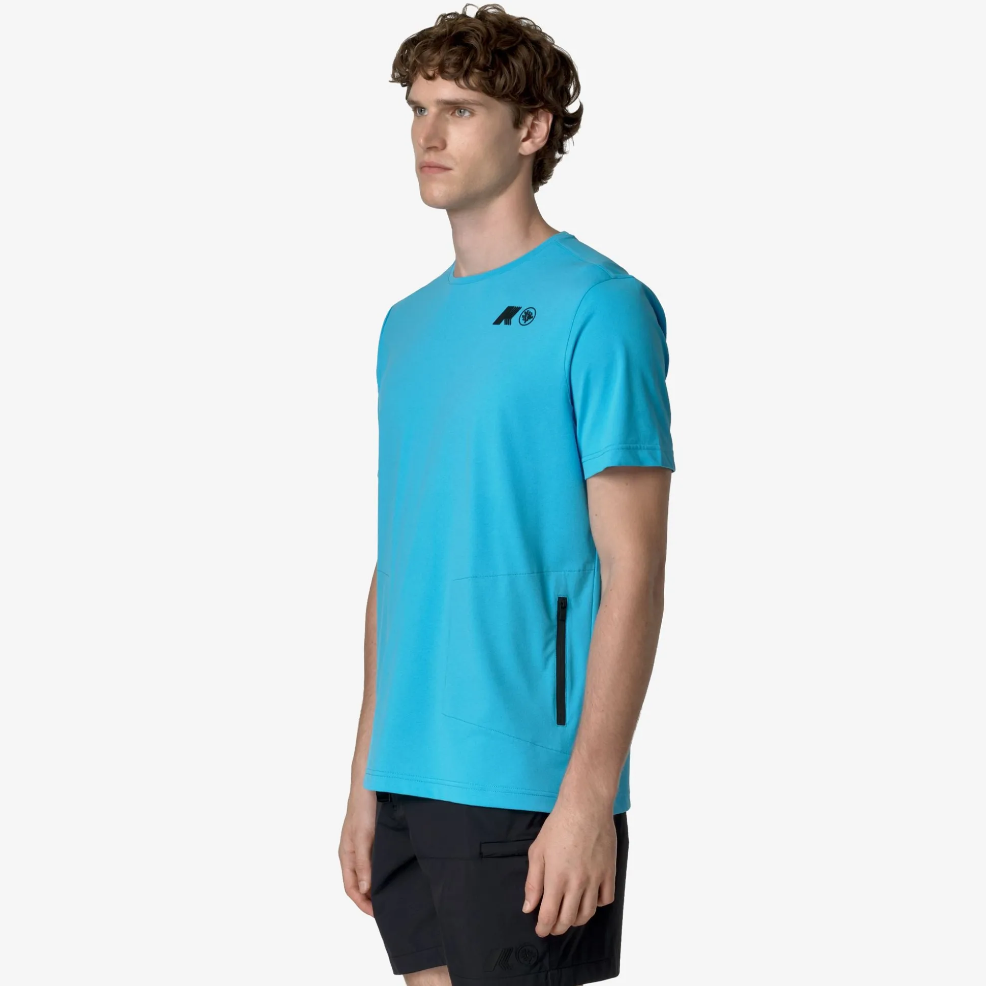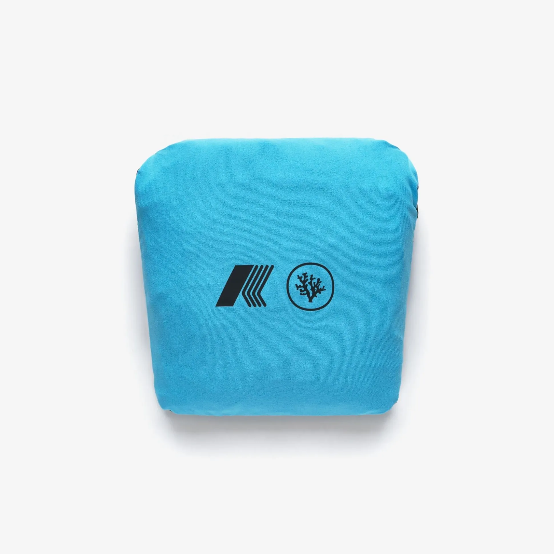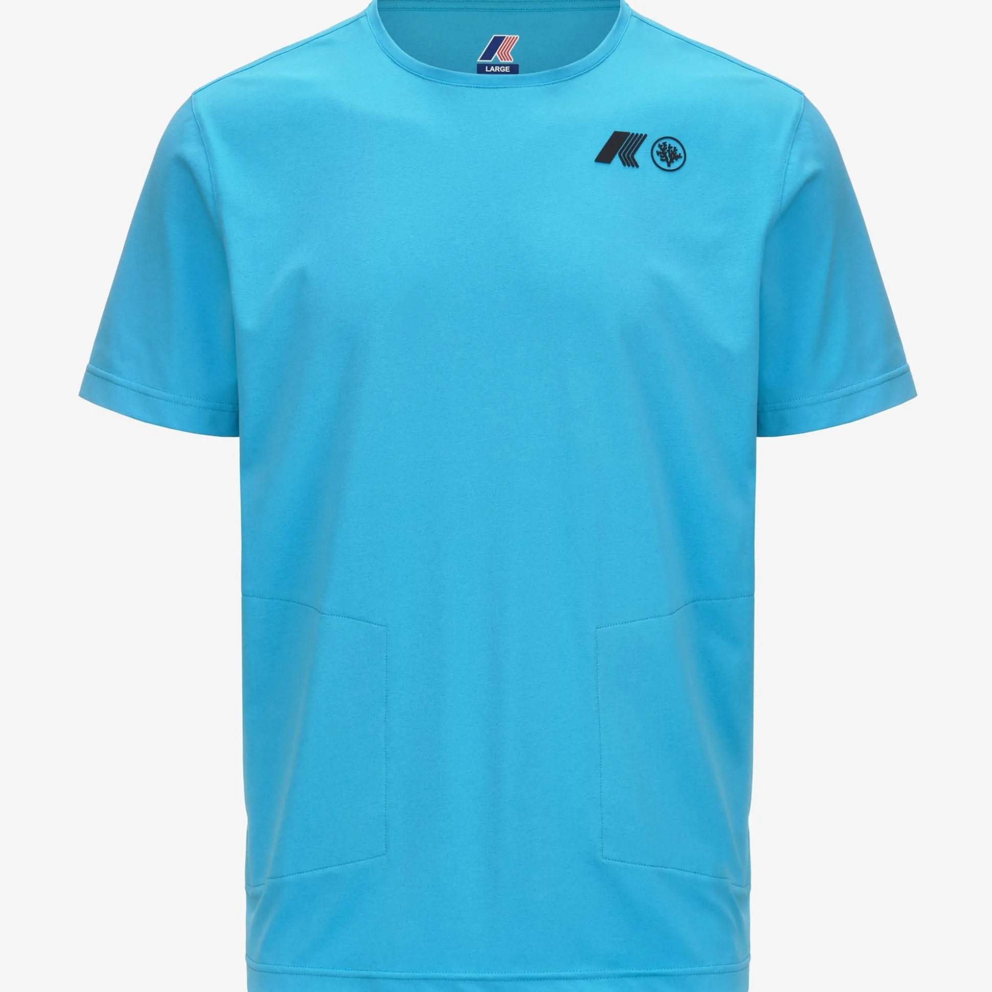T-shirt a maniche corte impacchettabile, realizzata in jersey di polyestere riciclato. Tasca impacchetabile con sacco tasca in mesh di colore azzurro. Personalizzato con il logo K-WAY x CORAL GARDENERS.