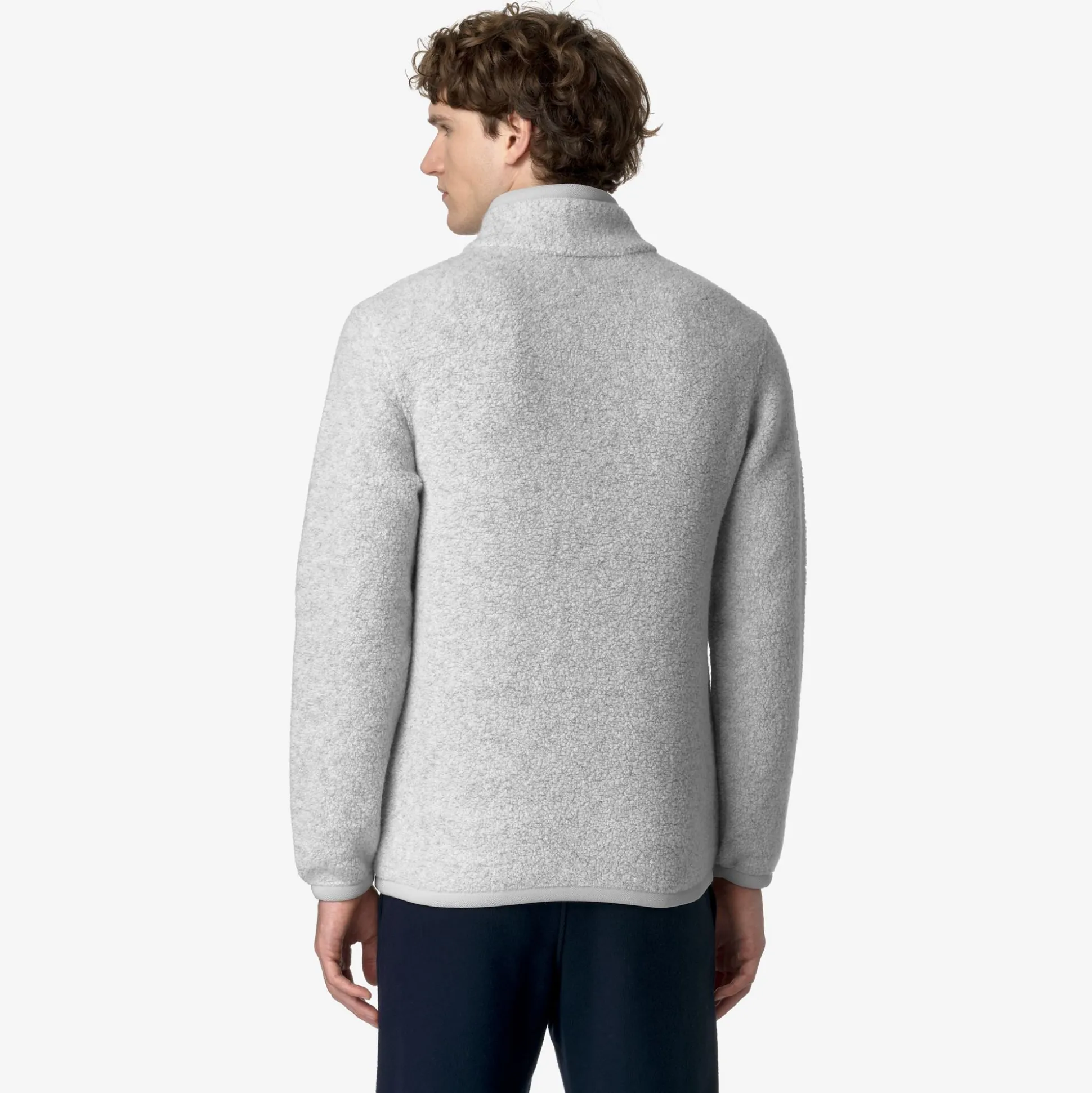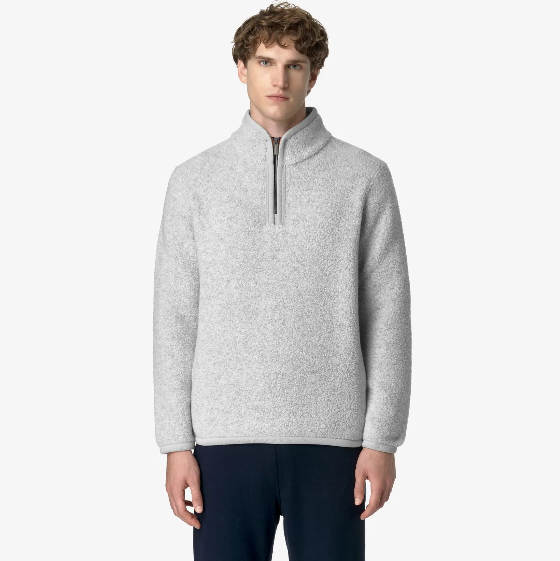 Ern è un pullover da uomo dal look caldo, morbido e accogliente, ideale per le occasioni leisure e realizzato con un tessuto orsetto misto lana riciclato. Il modello, dalle linee essenziali, presenta vestibilità regolare, con polsini elastici, collo alto con chiusura half-zip e il dettaglio del tape nei colori iconici K-Way sul fianco.