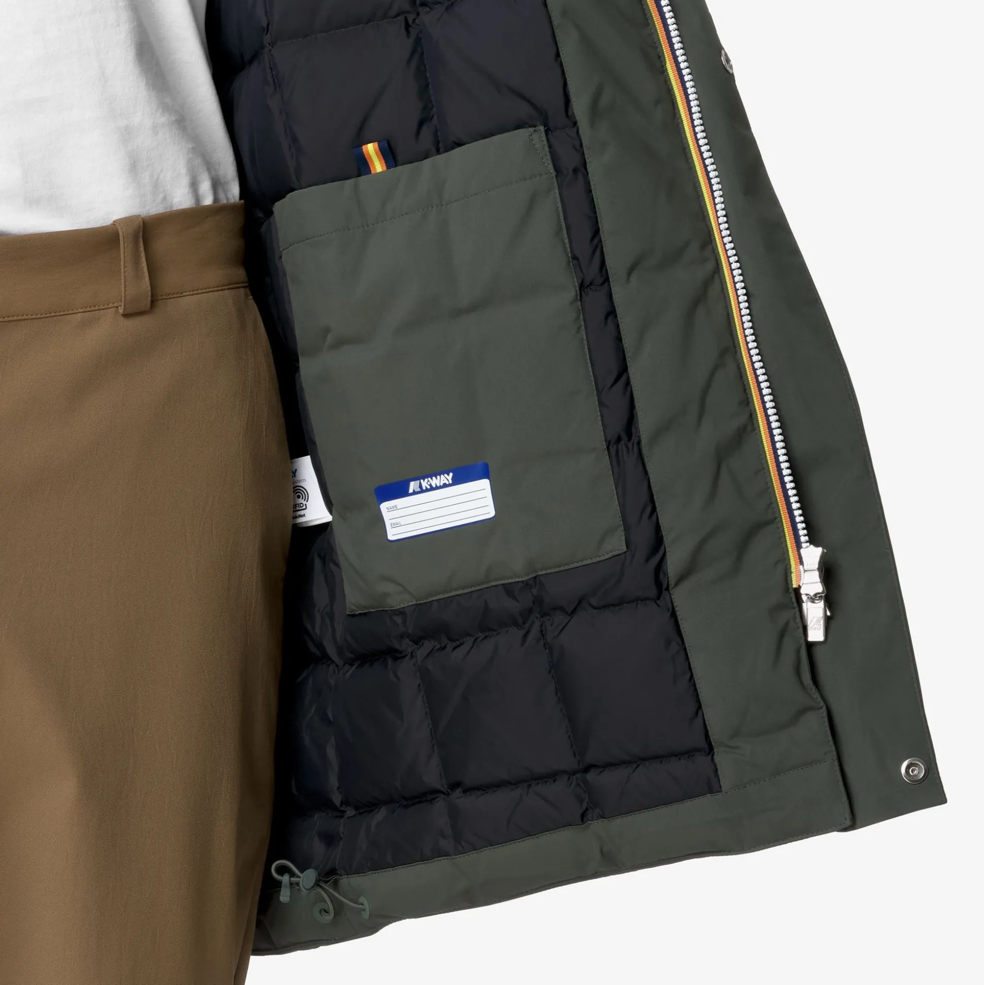 - Tessuto nylon trapuntato antivento, traspirante, con tenuta piuma