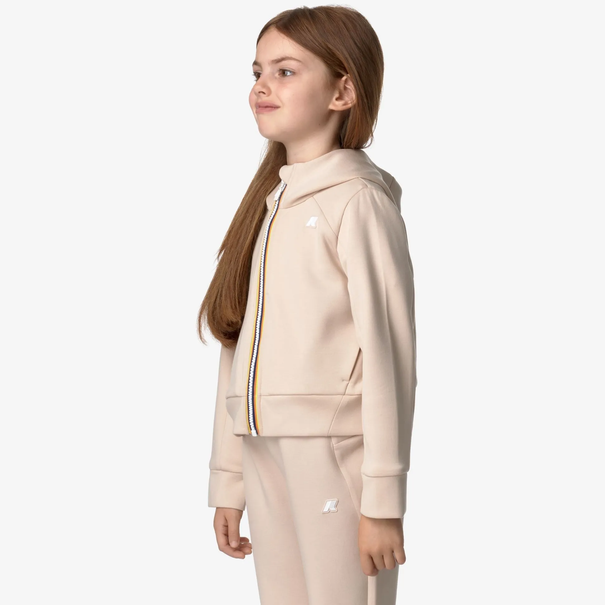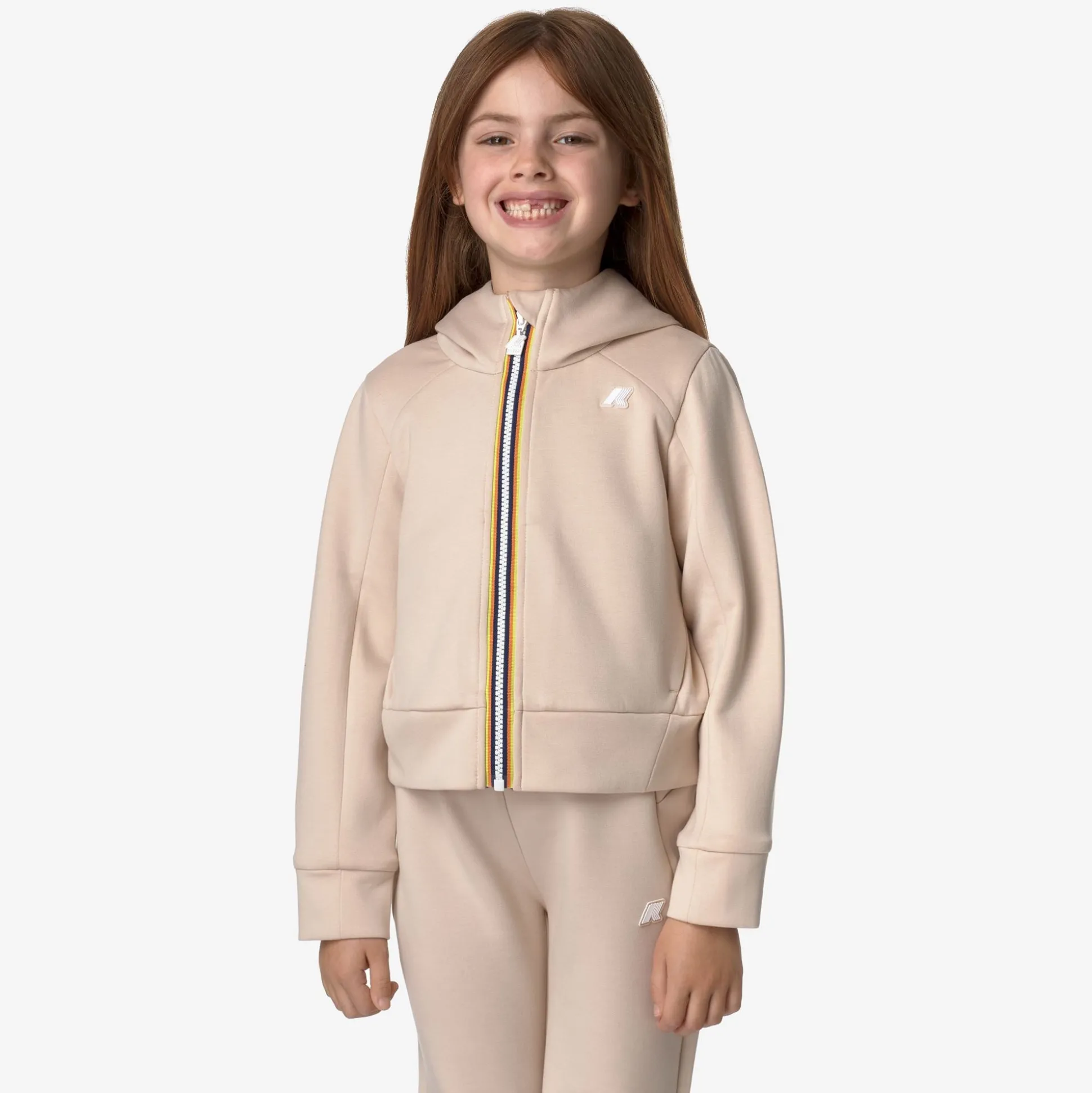 Divine è una felpa da bambina realizzata in scuba leggero, un materiale morbido e stretch che offre comfort e libertà di movimento. Il modello ha una vestibilità regolare e un look d’ispirazione sportiva. La felpa si caratterizza per il cappuccio, le due tasche laterali e la chiusura con zip rifinita con flap proteggi mento.